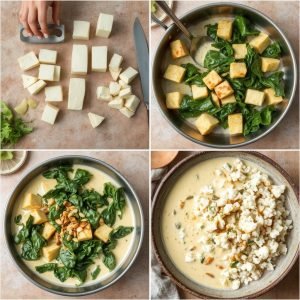 Denne gryten er en perfekt kombinasjon av kremet og fyldig tekstur med et snev av friskhet fra spinaten. Den delikate smaken av kokosmelk balanseres av krydder som spisskummen og et hint av hvitløk. Tofuen, som er gyllenstekt, gir retten en lett sprøhet og en myk innsiden som smelter i munnen. Gresskarkjerner på toppen tilfører et deilig knas og en nøtteaktig smak. Denne retten har en rund og mild smak, men med nok krydder til å gjøre den spennende. Jeg synes den passer like godt til hverdags som til helgen, når jeg vil servere noe ekstra godt.