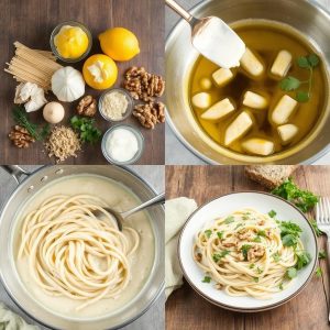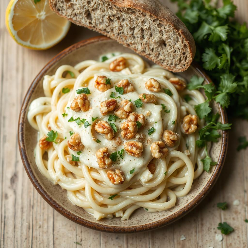 Et hint av muskatnøtt og hvitløk tilfører varme og dybde, mens sitronsaften frisker opp smaken og balanserer det fyldige. Ristede nøtter gir en sprø kontrast til den myke pastaen, og frisk persille eller basilikum tilfører en aromatisk, grønn friskhet som gjør retten enda mer innbydende.