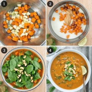 - Tilsett hakkede tomater, kokosmelk og grønnsaksbuljong. Kok opp, og senk varmen til lav. La det småkoke i 15–20 minutter til søtpotetene er møre.