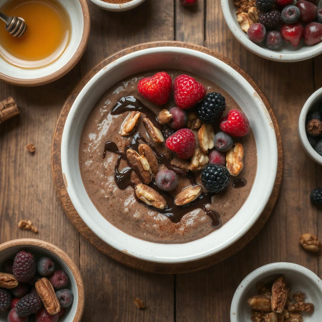 Sjokoladegrøten har en herlig fløyelsmyk konsistens, som gjør hver skje til en nytelse. Smaken av rik kakao balanseres perfekt av en liten sødme fra honningen, mens et dryss av kanel gir en varm og krydret undertone. Når grøten er toppet med friske bær, får du en frisk syrlighet som løfter smaken, mens de ristede nøttene tilfører et tilfredsstillende knas. Hver bit byr på en deilig kontrast mellom kremet grøt, smeltende sjokolade og teksturen fra toppingen – en frokost som både metter og gleder smaksløkene.