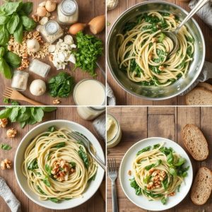 Denne pastaretten er en perfekt balanse mellom det silkemyke og det sprø, det fyldige og det friske. Den kremede sausen smyger seg rundt hver pastabit, med en mild nøtteaktig smak fra næringsgjæren som minner om parmesan. Spinaten gir en frisk, litt grønn smak, og sammen med muskat og hvitløk skapes en dypere aroma som gjør retten ekstra smakfull. De ristede nøttene tilfører en knasende kontrast og et snev av karamellisert dybde, noe som gjør at retten føles luksuriøs uten å være tung. En skvett sitronsaft balanserer det hele med en lett syrlighet, som løfter retten og gir den en frisk avslutning.