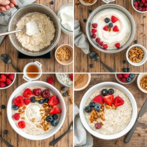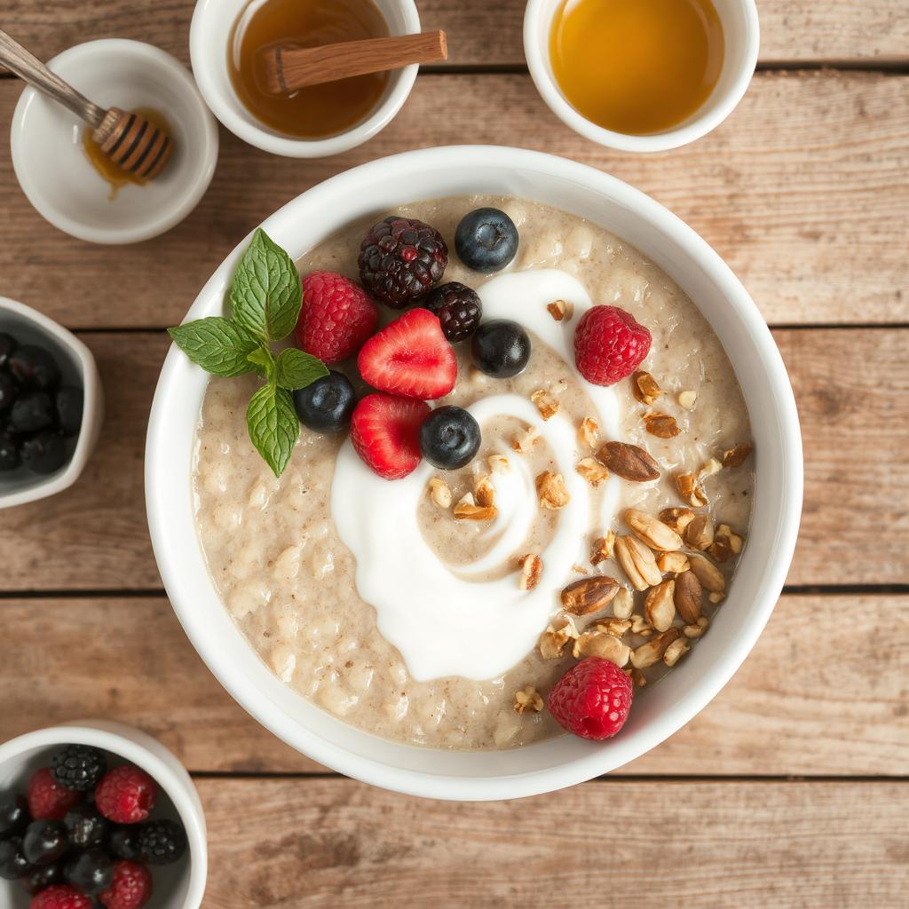 Denne syrlige grøten med yoghurt er inspirert av nordiske frokosttradisjoner der enkelhet og friskhet står i fokus. Jeg begynte å eksperimentere med yoghurt som topping for grøt da jeg ønsket noe lettere og friskere enn klassiske smør- eller sukkerbaserte alternativer. Kombinasjonen av kremet grøt og syrlig yoghurt med friske bær gir både en visuell og smakfull opplevelse. Det er blitt en favoritt i hjemmet vårt, spesielt om sommeren, da den føles lett, næringsrik og energigivende. Det er en oppskrift som enkelt kan tilpasses etter sesong og ingredienser du har tilgjengelig.
