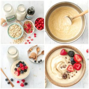 - Hell havremelk og havregryn i en liten gryte og sett på middels varme. Rør jevnlig for å unngå at havregrynene setter seg fast i bunnen.