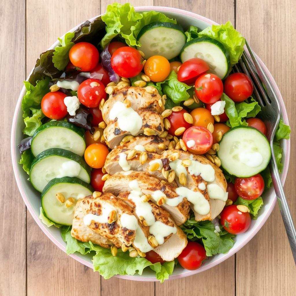 Denne salaten er en glede å spise. Den grillede kyllingfileten er mør og saftig, og smaker nydelig med et hint av krydder. Grønnsakene gir friskhet og knasende tekstur, mens cherrytomatene tilfører en naturlig sødme. Den kremede dressingen, laget med gresk yoghurt og sitrus, gir retten en lett syrlighet som balanserer smakene. Ristede gresskarkjerner gir en nøtteaktig smak og en tilfredsstillende crunch. Hver bit føles som en perfekt kombinasjon av friske og fyldige smaker, og retten er like god til lunsj som til middag.