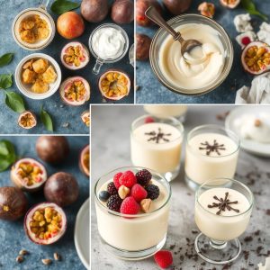- Rør sammen gresk yoghurt, honning, vaniljeekstrakt og pasjonsfruktsaften i en stor bolle.