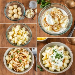 Kort Historie: Potetsalat er en tidløs rett som har vært en del av både fest- og hverdagsmåltider i Norge. Å tilsette løk som er stekt eller karamellisert, gir en dybde til smaken og tilfører salaten en nydelig sødme. Kombinert med rømme skapes en frisk og kremet rett som passer til alt fra grillmat til smørbrød. Jeg elsker hvordan denne oppskriften kombinerer klassiske og aromatiske smaker på en balansert måte.