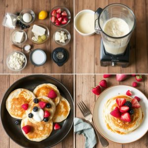 Disse pannekakene har en perfekt balanse mellom sødme og friskhet. Cottage cheese gir en kremet og lett syrlig undertone, mens havremelet tilfører en mild nøtteaktig smak og en luftig konsistens. De gyllenbrune pannekakene har en myk, men samtidig fast tekstur som gjør dem enkle å stable og spise. Toppingen med friske bær gir en eksplosjon av sødme og syrlighet, mens yoghurt og chiafrø gir en glatt og sprø kontrast. Duften av vanilje og nyristede pannekaker gjør dette til en fryd for sansene.