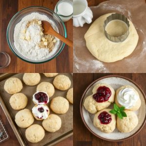Jeg lager ofte disse sconesene når vi har uventede gjester, fordi de er raske å lage og alltid imponerer. Første gangen jeg prøvde å bake dem, var jeg nervøs for om de ville heve, men med kaldt smør og lett håndtering av deigen ble de helt perfekte! Et tips jeg har lært er å bruke en gaffel for å blande smøret inn i melet – det gir den luftige konsistensen. Jeg liker også å eksperimentere med toppinger, for eksempel å bruke rørte bær i stedet for syltetøy eller tilsette litt sitronskall i kremen.