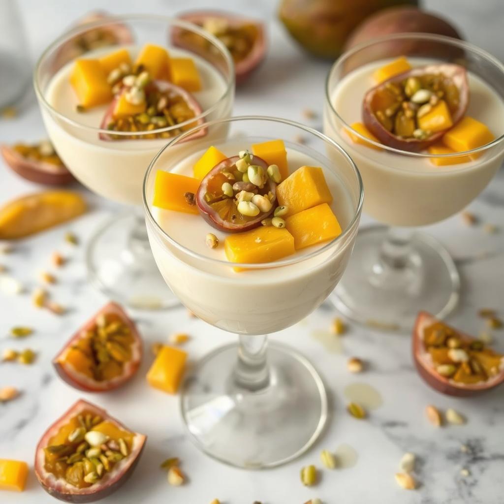 Pannacotta er en klassisk italiensk dessert kjent for sin silkemyke konsistens og rike smak. Den har blitt populær over hele verden for sin enkelhet og eleganse. Denne varianten med kondensert melk gir et moderne og luksuriøst preg. Jeg oppdaget denne oppskriften da jeg lette etter noe spesielt til en familiemiddag, og den har siden blitt en av mine favoritter. Toppingen av tropiske frukter gir en frisk og eksotisk dimensjon, som gjør den perfekt til både sommerfester og rolige kvelder hjemme. Det er en dessert som alltid imponerer og bringer glede.