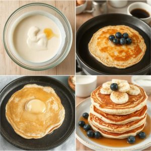 - Legg pannekakene på en tallerken og topp med friske bær, yoghurt eller ønsket tilbehør.