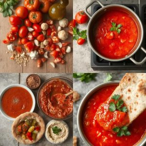 Matbucha er en klassisk nordafrikansk tomatdipp med røtter i Marokko. Navnet betyr “kokt salat,” og retten består av langsomt kokte tomater og paprika blandet med hvitløk, olivenolje og krydder. Matbucha serveres ofte som en del av en mezze, som tilbehør til brød, eller som en base for andre retter. Jeg elsker Matbucha for dens dype, karamelliserte smaker og hvordan den passer perfekt til både hverdagsmåltider og spesielle anledninger.