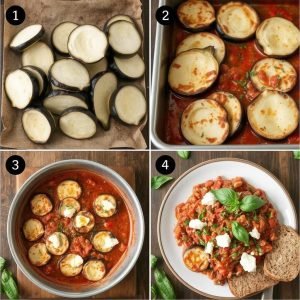 - Montering og servering: Legg de bakte aubergineskivene på et fat, topp med tomatsaus og dryss over fetaost eller ristede pinjekjerner. Pynt med frisk persille og server med ønsket tilbehør.