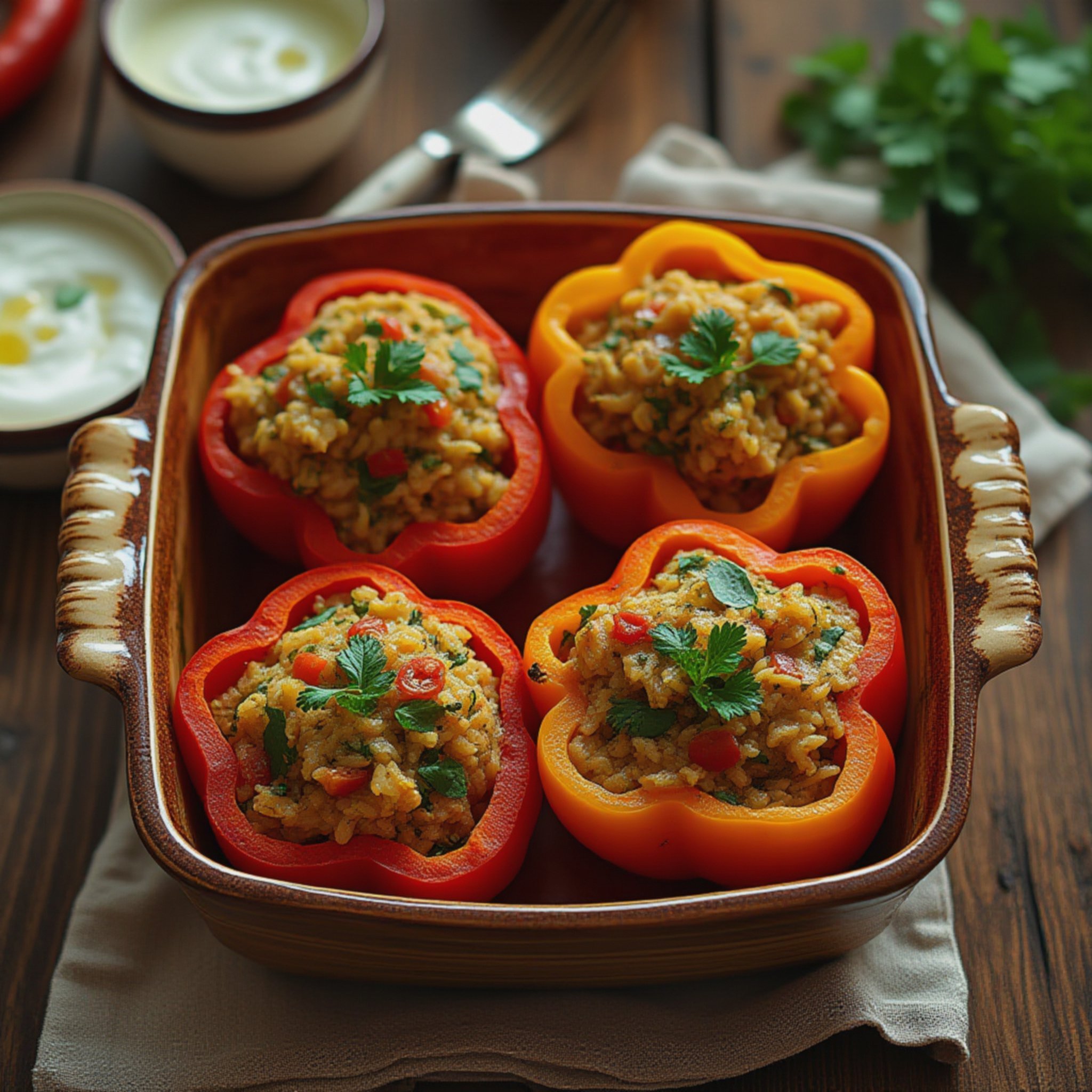 Når du setter tennene i en ovnsbakt paprika fylt med urter og grønnsaker, møter du en harmonisk blanding av sødme, varme og friskhet. Paprikaen er mør og litt karamellisert på utsiden, mens fyllet inni er saftig og aromatisk. Den grove fullkornsrisen gir tyggemotstand, mens squash og gulrot tilfører både farge og sødme. En klype kanel i fyllet gir et hint av eksotisk varme – nesten som et hemmelig krydder. Jeg elsker hvordan hele kjøkkenet lukter når disse paprikaene står i ovnen – det er som et teppe av sommer, urter og forventning.