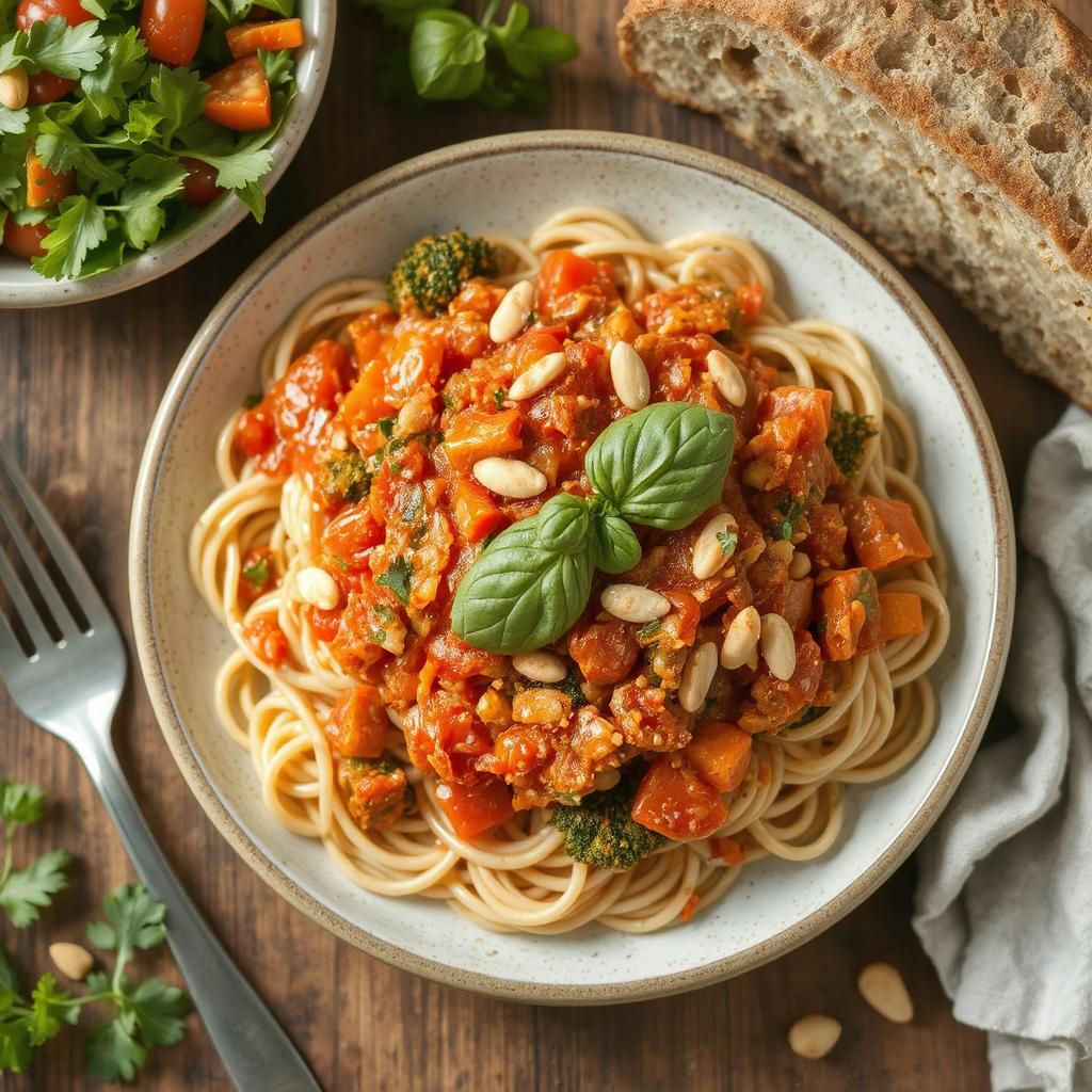 Pasta med tomatsaus og grønnsaker er en av de første rettene jeg laget da jeg begynte å utforske sunnere matlaging. Jeg husker at barna mine elsket det, og vi lagde alltid litt ekstra for å ha til lunsj dagen etter. Et lite tips jeg kan dele, er å bruke friske tomater om mulig, da de gir en ekstra sødme og friskhet til sausen. Jeg bruker alltid fullkornspasta for ekstra fiber og næring – og så liker jeg å toppe retten med ristede pinjekjerner for litt ekstra crunch.