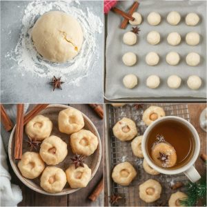 • Form Kakene: Del deigen i små biter og trill til små kuler (ca. 1 cm i diameter). Plasser kulene på bakeplaten med litt avstand mellom.