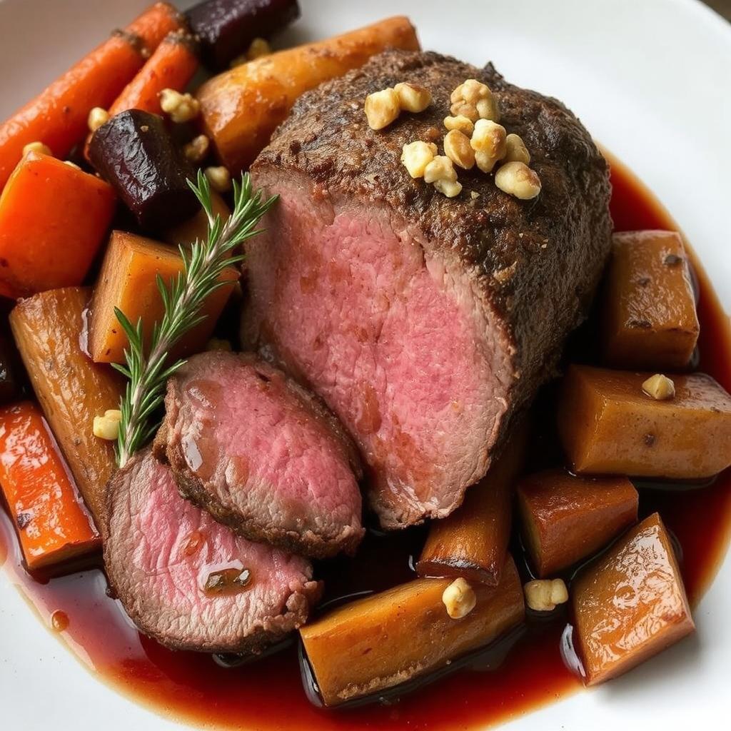 - Servering: Legg biffene på tallerkener, hell over litt rødvinssaus og server med ovnsbakte rotgrønnsaker. Dryss over ristede valnøtter for ekstra crunch.