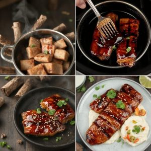 Denne retten gir en spennende smakskombinasjon hvor det salte pinnekjøttet møter en søt, krydret og umami-rik asiatisk glaze. Glazen gir kjøttet en klebrig, karamellisert overflate, mens det tradisjonelle, møre kjøttet beholder sin saftige og intense smak. Ingefær og hvitløk tilfører en pikant krydret dybde, mens sesamolje gir en nøtteaktig aroma. Jeg elsker hvordan den søte og syrlige limen frisker opp retten og balanserer det salte kjøttet – en eksplosjon av smaker som gir en ny vri på en gammel klassiker.