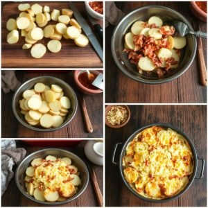 Smør en ildfast form med smør. Legg et lag potetskiver i bunnen, dryss over litt sprøstekt bacon, hell over litt fløtesaus og dryss på litt ost. Gjenta lagene til alt er brukt, og avslutt med fløtesaus og et godt lag ost på toppen. - Bak gratengen: