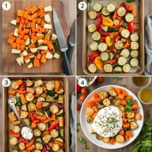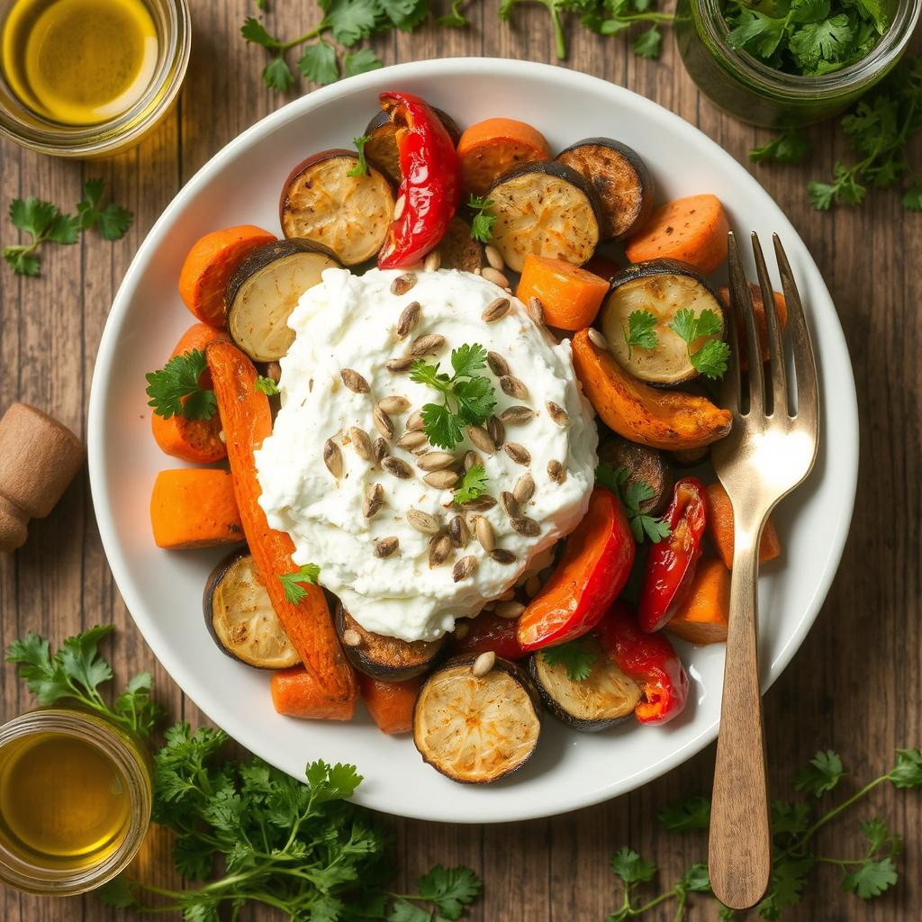 Denne retten kombinerer en silkemyk og kremet tekstur fra cottage cheese med grønnsakenes søte og lett karamelliserte smak. Grønnsakene får en deilig konsistens etter å ha blitt ovnsbakt, myke med en lett sprø kant. Den milde smaken av cottage cheese balanseres perfekt av grønnsakenes naturlige sødme og krydderets aroma. Hver bit føles som en harmoni av kremethet, sødme og friskhet, med et hint av krydder som løfter retten. Friske urter gir en ekstra dimensjon av friskhet som gjør denne retten både sunn og smakfull.