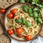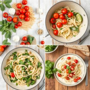 Pasta har lenge vært en av mine go-to retter når jeg trenger noe raskt, men likevel smakfullt og næringsrikt. Denne oppskriften er inspirert av klassikeren “aglio e olio”, en enkel, men ikonisk italiensk rett med hvitløk og olivenolje. For å gjøre den mer mettende og sunnere har jeg tilsatt fersk spinat, saftige cherrytomater og en lett, kremet saus laget med havrefløte.