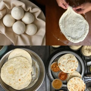 Bland hvetemel, salt og sukker i en stor bolle. Tilsett egget og smeltet smør/ghee. Tilsett vann litt etter litt og elt til du har en myk, smidig deig. Deigen skal være elastisk, men ikke klissete. - Hvile deigen:
