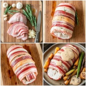 aconsurret svinefilet har røtter i europeisk kjøkken, hvor bacon ofte ble brukt for å tilføre smak og holde kjøttet saftig. Retten ble raskt en favoritt for festlige anledninger på grunn av sin saftighet og elegante presentasjon. I dag er den også en populær middagsrett i norske hjem. Kombinasjonen av det milde svinekjøttet og det salte baconet gjør retten til en smakfull klassiker. Jeg oppdaget denne oppskriften for flere år siden, og nå lager jeg den ofte både til hverdags og når vi får gjester.