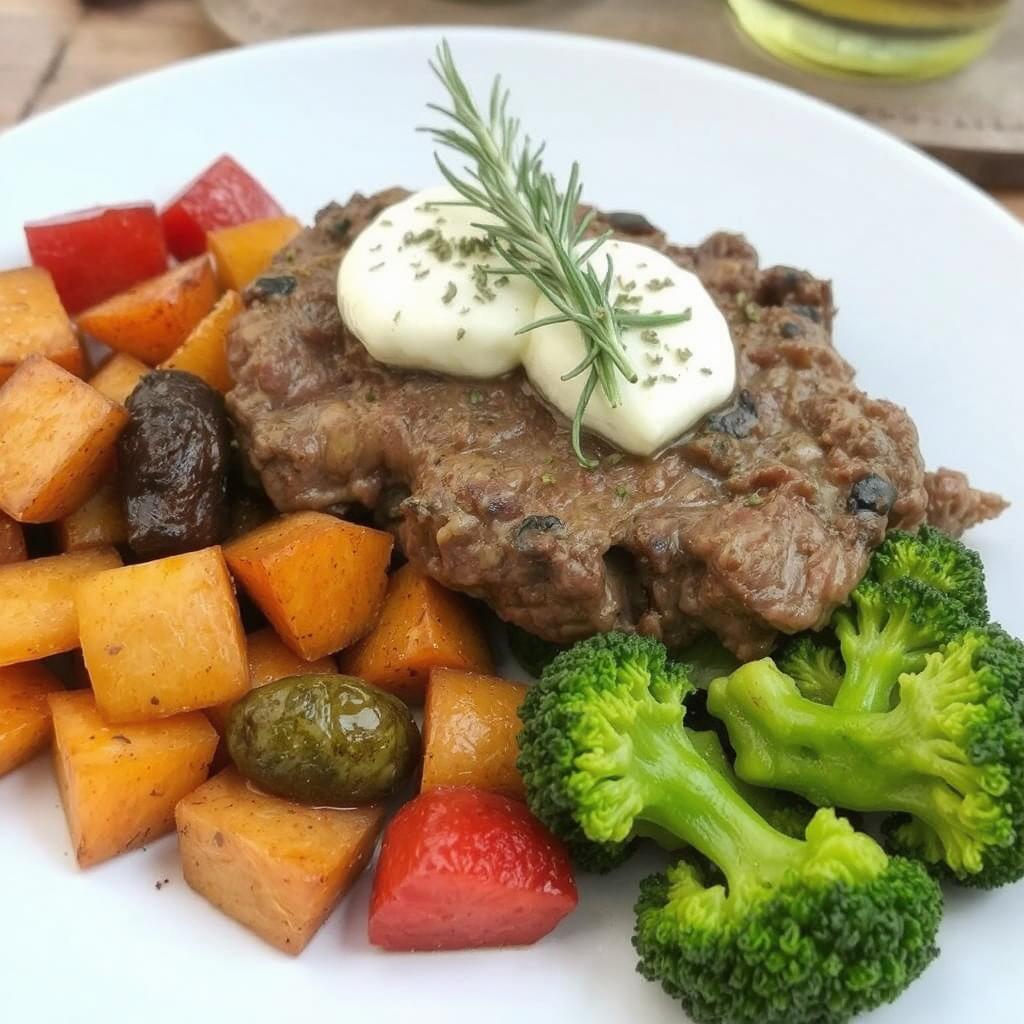 Denne retten har en perfekt balanse av smak og tekstur. Biffen er mør og saftig, stekt til en gyllenbrun overflate som låser inne alle saftene. Den kremete brien smelter elegant over biffen og gir en silkemyk konsistens med en mild nøtteaktig smak. Urtene tilfører en frisk og aromatisk tone, mens grønnsakene gir en lett sødme og sprøhet som komplementerer det hele. Smakene smelter sammen på en måte som gjør hver bit til en rik og harmonisk opplevelse.