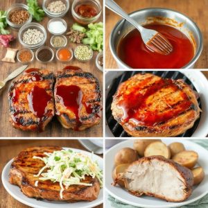 - Server kotelettene med ekstra grillsaus ved siden av, frisk kålsalat og ovnsbakte poteter.