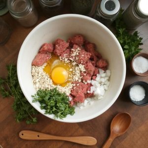 - Lag kjøttbollene: Bland karbonadedeig, egg, havremel, hvitløk, oregano, salt og pepper i en bolle. Form små kjøttboller med hendene.