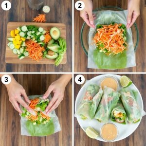 Det jeg elsker mest med disse rullene, er hvordan de danser i munnen! Mangoen er søt og saftig, mens avokadoen glir inn som silkemyk kontrast. Sprø gulrøtter og agurk gir tyggemotstand, og rispapiret knitrer nesten litt når du biter i det. Friske urter som koriander og mynte gir et aromatisk løft, og peanøttsausen? Den gir både fylde, salt og et lite hint av sødme. Alt dette samler seg i en perfekt balanse – lett, men likevel tilfredsstillende. Jeg kjenner meg alltid både mett og lett etterpå. Dette er virkelig mat som gir godfølelse!
