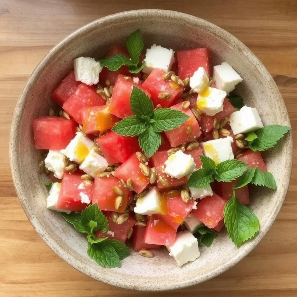 Vannmelon- og fetasalat er en frisk og fargerik rett med middelhavsinspirasjon. Denne kombinasjonen av søt vannmelon og salt fetaost har blitt en sommerfavoritt for mange, perfekt til grillmat eller som en lett lunsj. Retten sies å ha oppstått som en kreativ måte å utnytte sesongens ferskeste råvarer, og har siden blitt en global klassiker. For meg bringer denne salaten minner om varme sommerdager og måltider ute i solen.