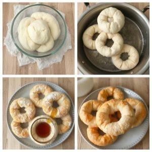 - Del deigen i 12 like deler. Form hver del til en ball og lag et hull i midten med fingrene. Strekk litt for å lage en smultringform. La dem hvile i 10–15 minutter.