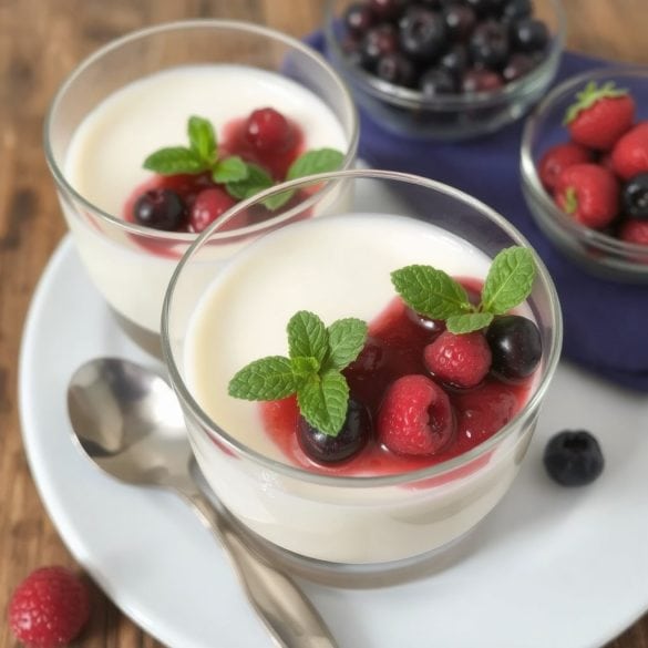 Den visuelle kontrasten mellom den lyse Panna Cottaen og de fargerike bærene gjør denne desserten til et blikkfang på bordet. Server den etter et lett måltid, eller som et høydepunkt til en spesiell anledning.