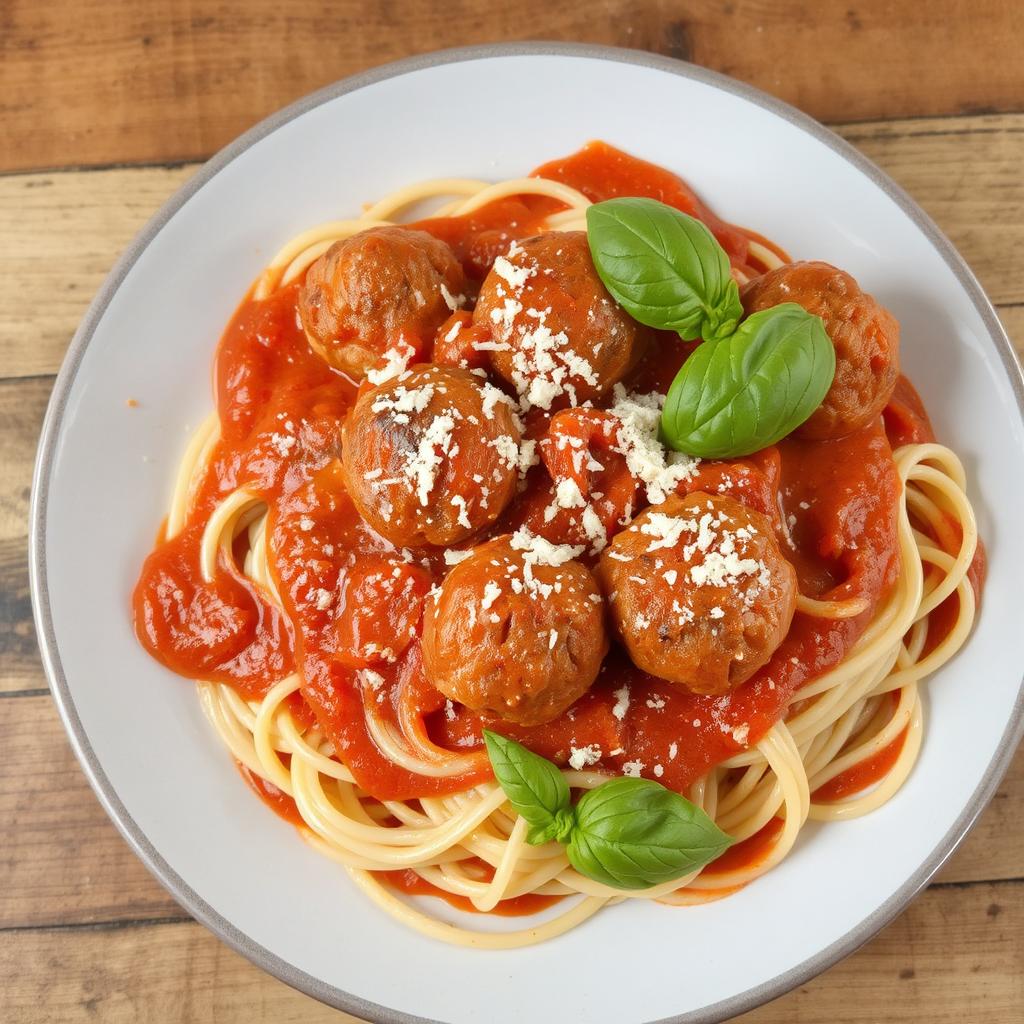 - Servering: Fordel spaghetti på tallerkener, topp med kjøttboller og saus, og pynt med parmesan og basilikum.