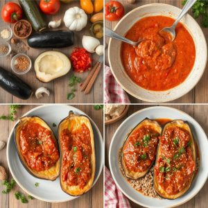 - Servering: Legg de bakte auberginene på et fat, topp med den krydrede tomatsausen og dryss over ristede sesamfrø og friske urter. Server med fullkornsris, quinoa eller brød.