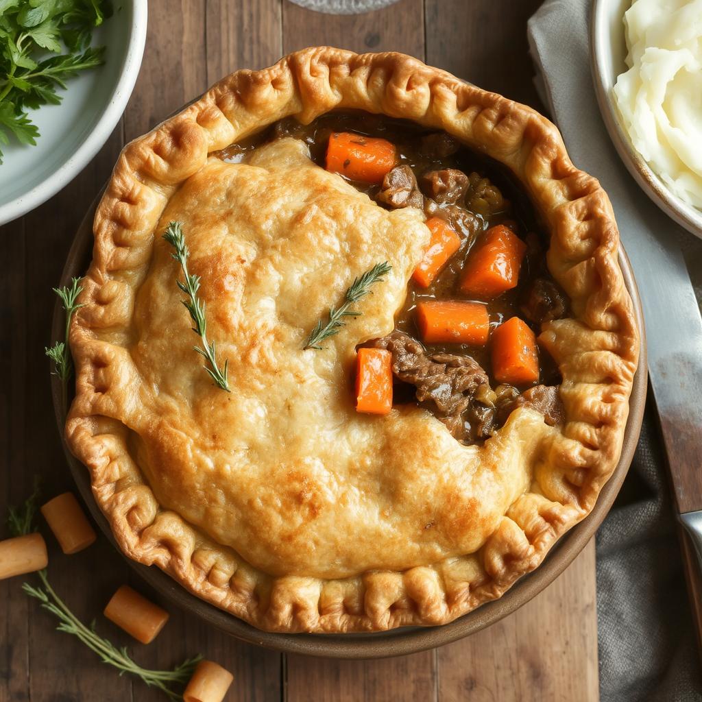 - Forbered fyllet: Varm olivenolje i en stor panne på middels varme. Brun biffkjøttet i porsjoner og sett til side. Fres løk, gulrøtter og sellerirot til de er myke. Tilsett tomatpuré og rør godt. Hell i oksekraften, tilsett timian og worcestershiresaus, og la det småkoke i 15 minutter til fyllet tykner. Smak til med salt og pepper.
