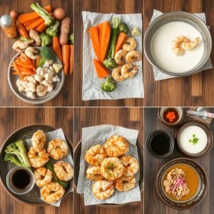 Forbered ingrediensene: Skrell rekene, og skjær grønnsakene i tynne skiver. Klapp alt tørt med kjøkkenpapir for å sikre en sprø røre.