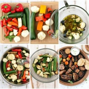 - Mariner grønnsakene: Ha grønnsakene i en stor bolle eller ziplock-pose. Hell over marinaden og vend godt slik at alle grønnsakene blir jevnt dekket. La det marinere i 10–15 minutter.