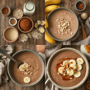 Sjokoladegrøt med banan er en herlig, næringsrik frokostrett som er både trøstende og energigivende. Grøt har lenge vært en populær frokost i mange hjem, spesielt i kaldere måneder, og har fått et moderne preg ved å tilsette nye smaker og alternativer som er mer helsebevisste. Denne sjokoladegrøten med banan stammer fra en tid hvor grøt var et rimelig og næringsrikt måltid, men har utviklet seg til å bli en smakfull nytelse. Med bruk av havremelk og naturlige søtstoffer, har retten fått et sunnere og mer moderne preg, samtidig som den beholder den klassiske grøtens trøstende effekt.