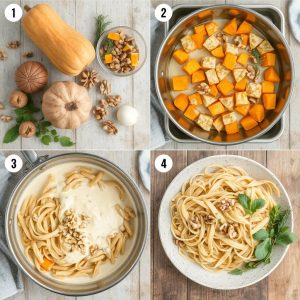 Denne pastaretten er en liten symfoni av smaker og teksturer. Den myke, kremete sausen smelter sammen med pastaen og gir en fyldig og fløyelsmyk munnfølelse. Gresskaret tilfører en naturlig sødme som harmonerer perfekt med den lette nøtteaktige bitterheten fra valnøttene. Litt friskpresset sitron og et dryss næringsgjær gir en lett syrlighet og umami, som gjør at retten føles balansert og full av dybde. Valnøttene gir en deilig knasende kontrast, og et hint av muskatnøtt runder det hele av med en varm og krydret undertone. Jeg liker å strø litt ristede gresskarkjerner over for ekstra crunch – det gir en deilig tekstur mot den silkemyke sausen.