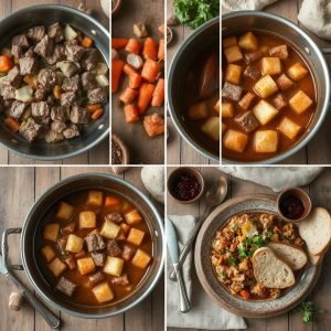 - Brun kjøttet: Varm olje i en stor gryte på medium høy varme. Brun kjøttet i omganger til det får en gyllen overflate. Sett til side.