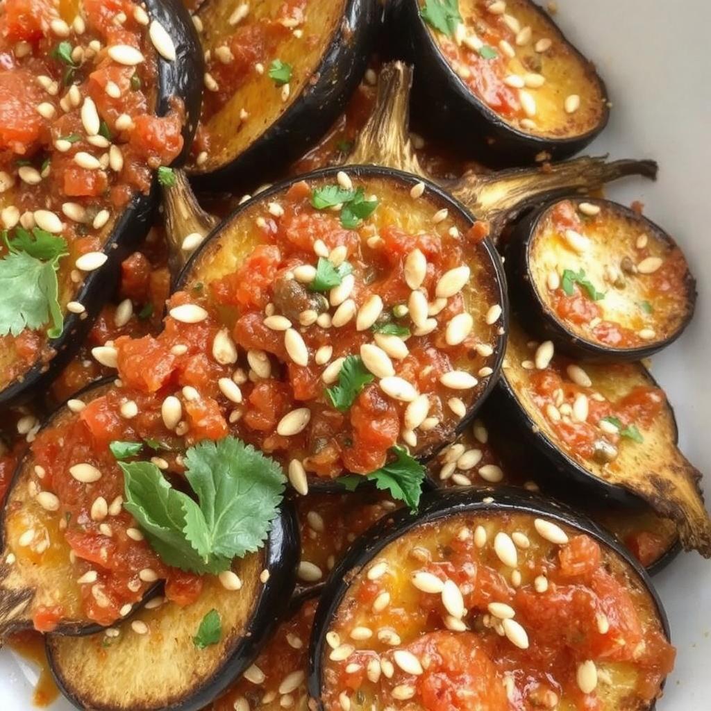 Sunn ovnsbakt aubergine med krydret tomatsaus