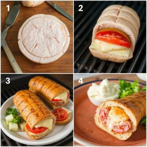 - Fyll korven: Smør dijonsennep forsiktig inn i snittene. Fyll hver lomme med en blanding av paprika og rødløk. Dryss ost over toppen.