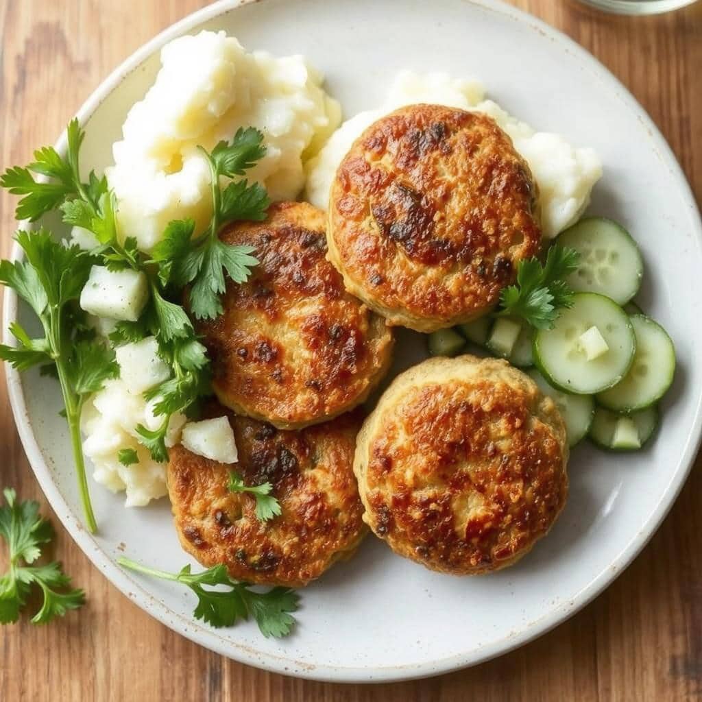 Anrett wallenbergerne på en tallerken med potetmos og agurksalat ved siden av. Pynt gjerne med friske urter som persille eller dill for en ekstra touch.