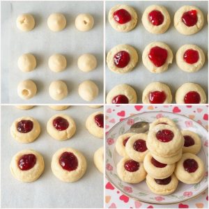 - Form Kakene: Del deigen i ca. 20 små biter og trill dem til kuler. Legg kulene på bakeplaten og trykk en fordypning i midten av hver kule med tommelen eller baksiden av en skje.