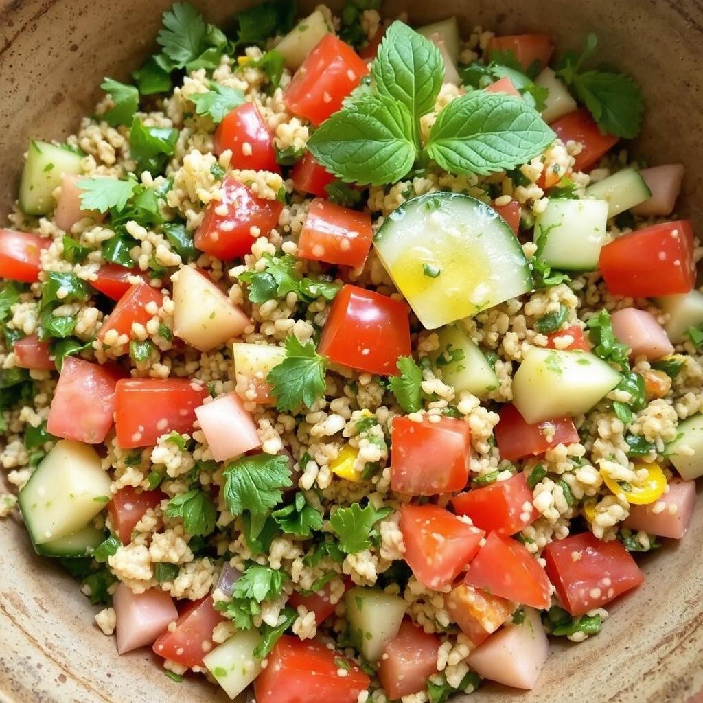 Jeg lager Tabouleh med mynte når jeg vil ha en lett, sunn og smakfull siderett. Mitt beste tips er å bruke ferske urter og å finhakke alle ingrediensene for en jevn tekstur. La salaten stå i kjøleskapet i 15-20 minutter før servering for å la smakene sette seg. En av mine beste minner er å servere denne retten som del av en mezze-buffé – den var en umiddelbar favoritt!