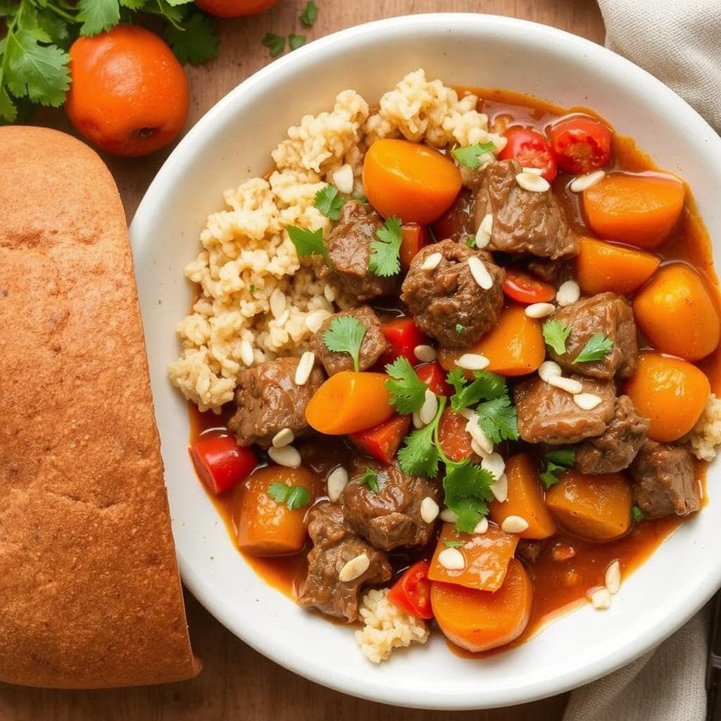 Denne taginen byr på møre biter av lam som smelter i munnen, omgitt av en søt, krydret og aromatisk saus. Aprikosene tilfører en sødme som balanserer krydderet, mens grønnsakene gir en myk, men strukturert tekstur. Jeg elsker hvordan hver bit føles som en eksplosjon av smaker.