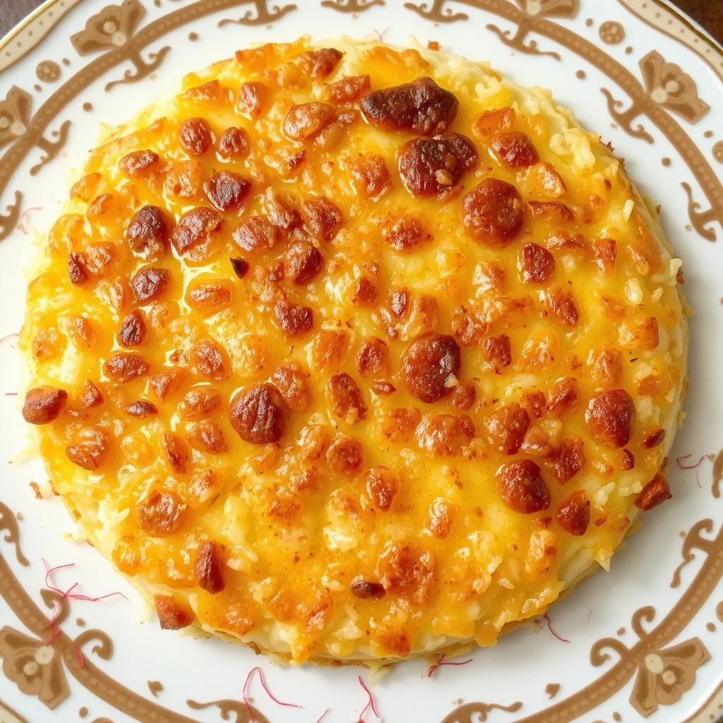 - Når risen er ferdig, legg et stort fat oppå gryten og snu den raskt, slik at Tahdig kommer ut i ett stykke. Nyt den sprø, gyldne herligheten!
