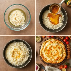 - Smelt smør i en non-stick-gryte på lav varme. Tilsett safranvannet og 1 dl vann. Rør inn 2 ss yoghurt hvis du ønsker en kremet skorpe.