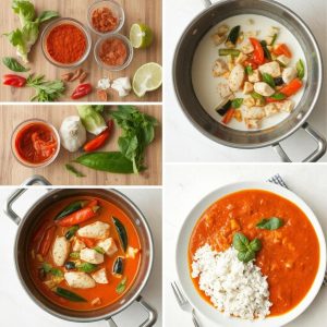 Thai red curry er en populær rett kjent for sin rike og kremete kokossaus, krydret med rød karripasta og balansert med aromatiske ingredienser som limeblad, sitrongress og chili. Denne retten kan lages med kylling, reker, tofu eller bare grønnsaker, og serveres ofte med dampet jasminris. Jeg elsker red curry for dens eksplosive smaker og varme som passer perfekt til både hverdagsmiddager og spesielle anledninger.